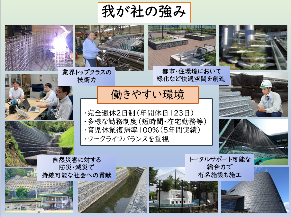 ほんの一例ですが、阪神甲子園球場のバックネットなどのスポーツ施設や上野動物園の動物舎などの有名施設をはじめ、大型商業ビルなど大都市圏でのヒートアイランド現象緩和に貢献する環境緑化向け金網資材の取扱いをしております。また、最近激甚化する大雨とか地震などの自然環境においては、土砂崩れや落石を防止する金網資材や、大雨被害から護岸を守るための土木資材など防災・減災の分野にも強みを発揮する社会貢献性の高い仕事をしております。